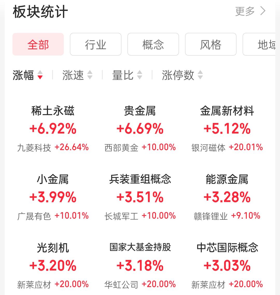 在板块方面,今日稀土永磁、贵金属、金属新材料、小金属、兵装概念、能源金属、光刻机几个板块表现得比较好。从板块表现看,资金从科技股今日回归。贵金属、能源金属、光刻机板块有持续的表现。