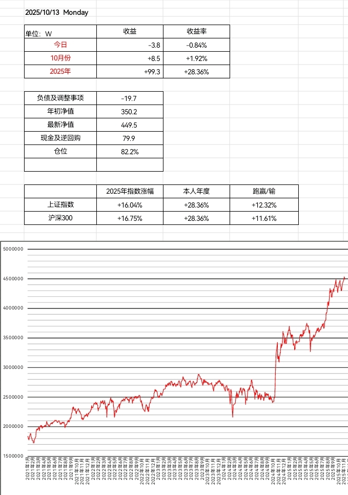 2025.10.13周一今日-3.8w(-0.84%)2025年+99.3w(+