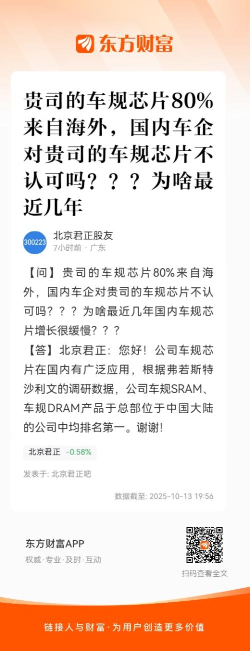 您好!公司车规芯片在国内有广泛应用,根据弗若斯特沙利文的调研数据,公司车规SRAM、车规DRAM产品于总部位于中国大陆的公司中均排名第一。谢谢!
