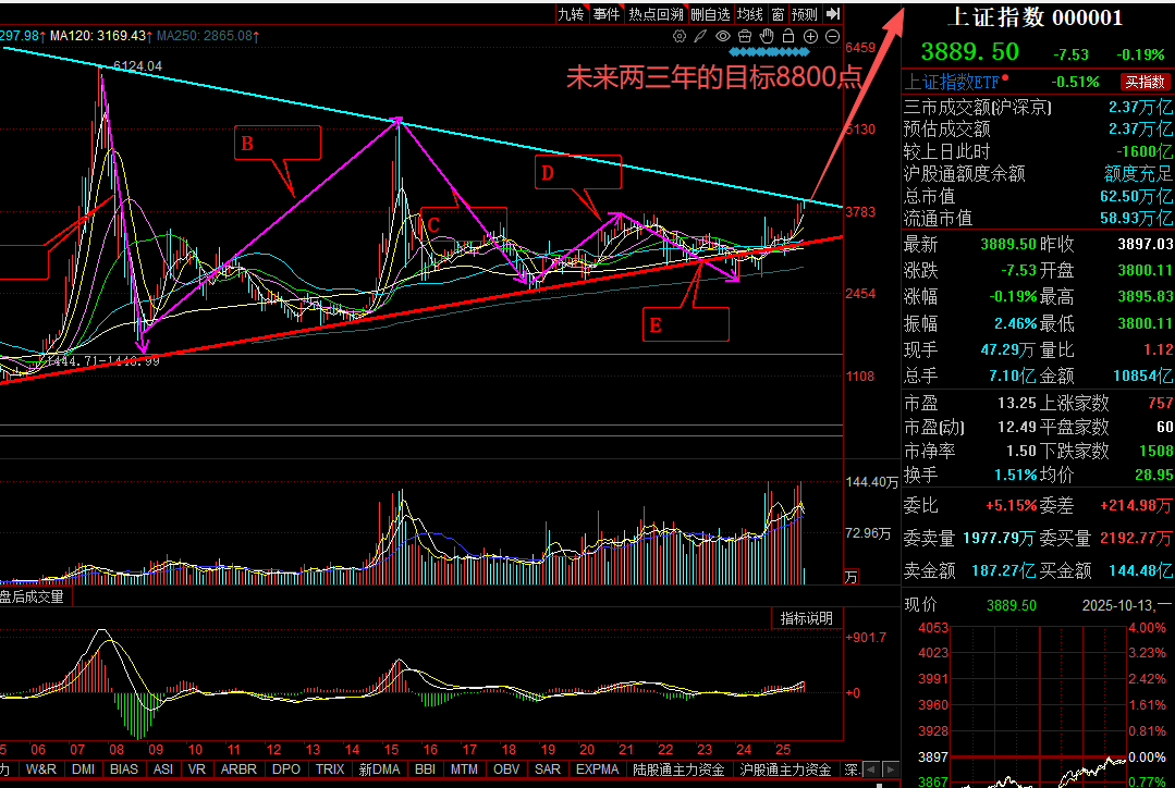上证指数已经完成了月线级别ABCDE的三角形调整,一旦突破上方的下降连线(蓝色线),后续主走震荡上行节奏,目标直指8800点