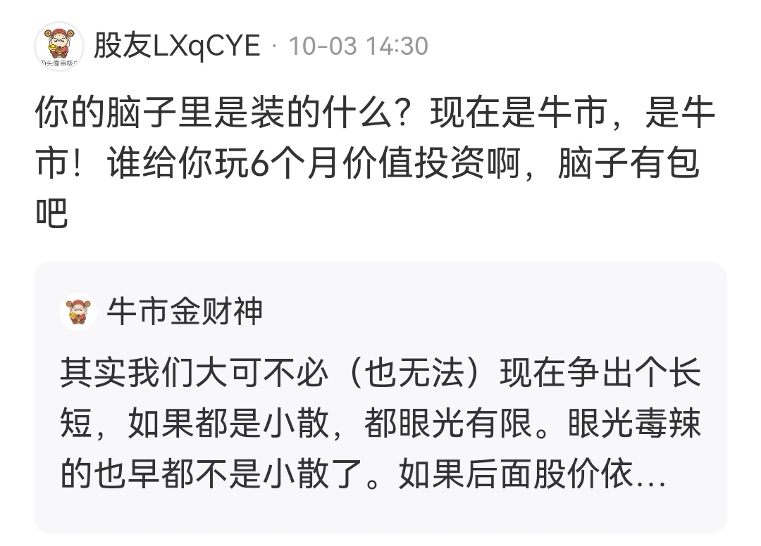 讨论个股票,没必要这么大气性,涨跌又不是我能说动的。看到不同观点,我从不会首先去攻击作者。