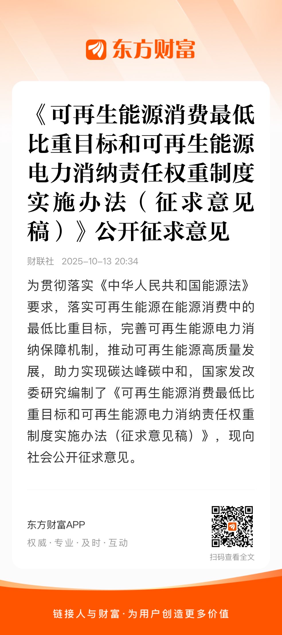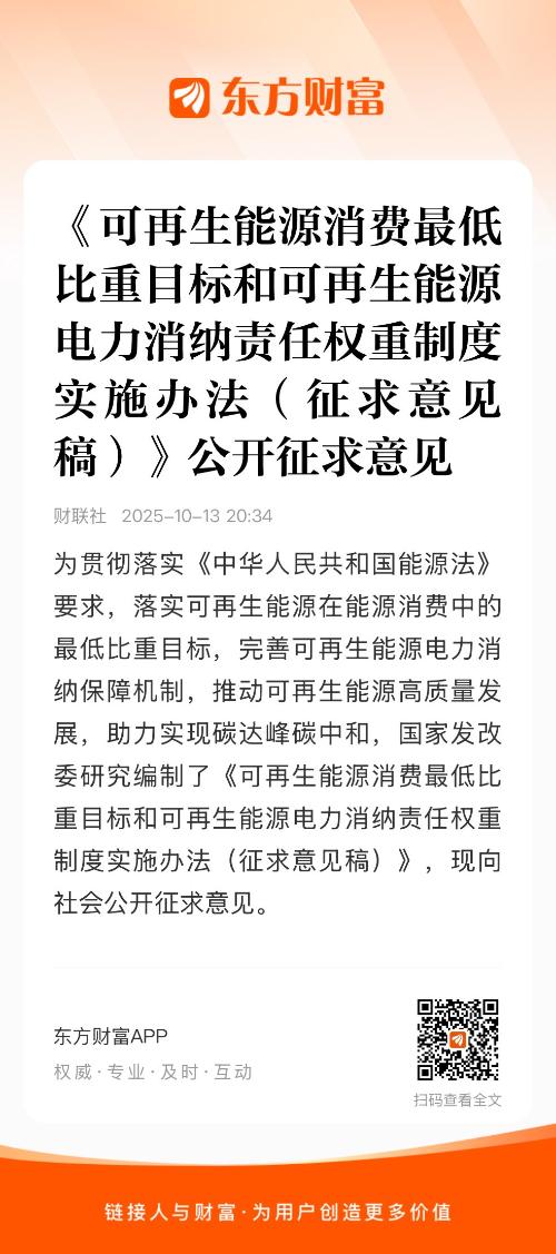 为贯彻落实《中华人民共和国能源法》要求,落实可再生能源在能源消费中的最低比重目标,完善可再生能源电力消纳保障机制,推动可再生能源高质量发展,助力实现碳达峰碳中和,国家发改委研究编制了《可再生能源消费最低比重目标和可再生能源电力消纳责任权重制度实施办法(征求意见稿)》,现向社会公开征求意见。