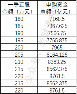 基于以上情况,申购资金规模可能在8000亿元至8200亿元间,按比例获配一手大约需申购200万元至205万元间的金额,每手正股对应申购资金每增减5万元就能对应到申购资金总额波动近200亿元。