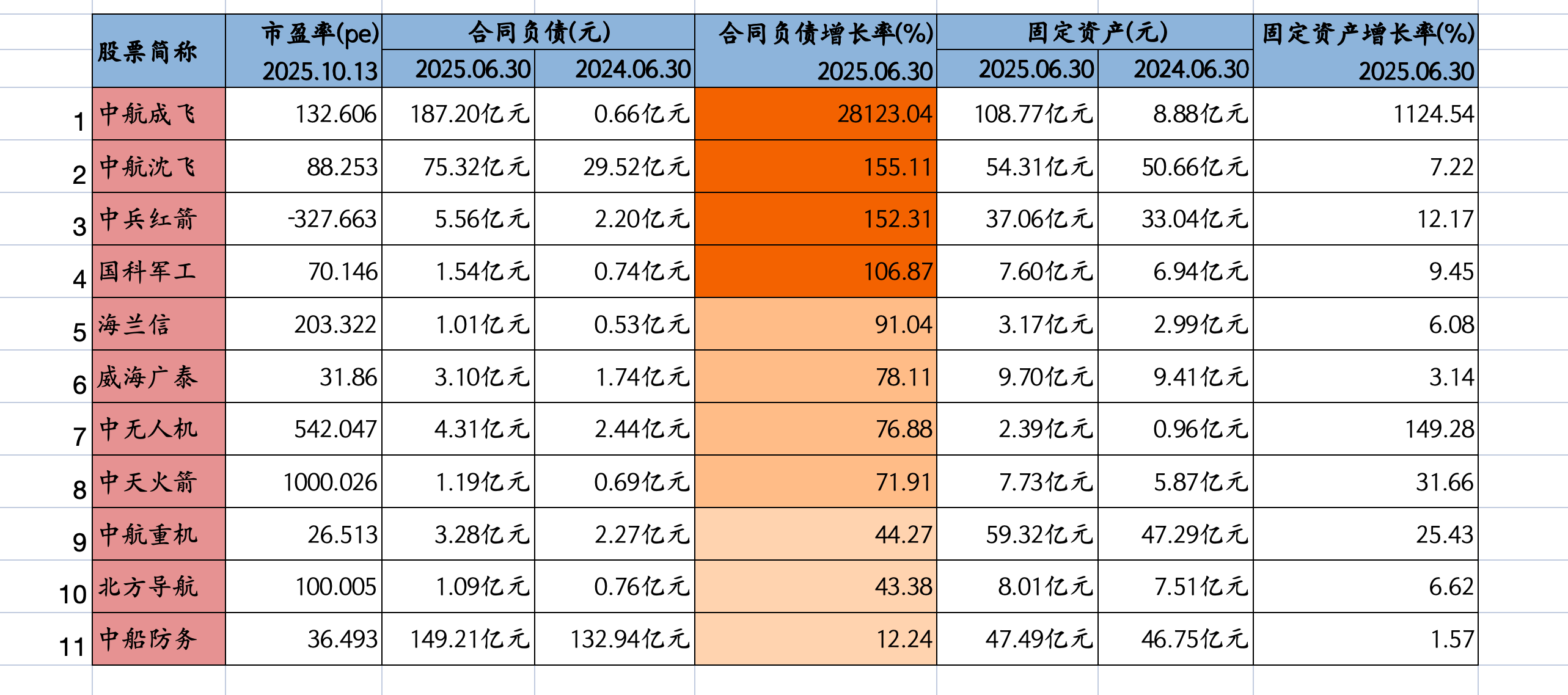 其中中航成飞的合同负债和固定资产同比增长都超过10倍,主要是因为资产重组。