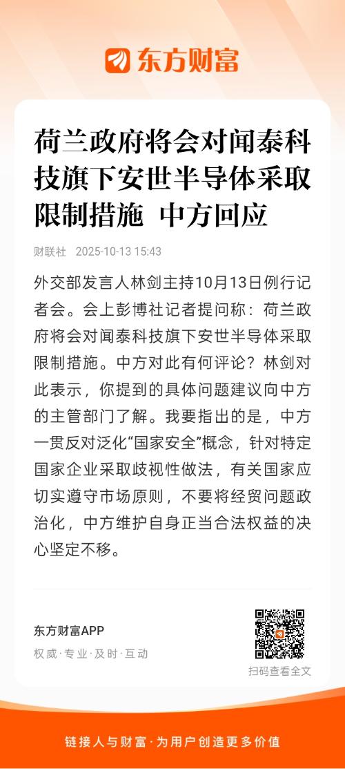 荷兰政府将会对闻泰科技旗下安世半导体采取限制措施 中方回应财联社7小时前约54秒芯片ETF基金2.1901.01%K图 600745_0据环球网,外交部发言人林剑主持10月13日例行记者会。会上彭博社记者提问称:荷兰政府将会对闻泰科技旗下安世半导体采取限制措施。中方对此有何评论?林剑对此表示,你提到的具体问题建议向中方的主管部门了解。我要指出的是,中方一贯反对泛化“国家安全”概念,针对特定国家企业采取歧视性做法,有关国家应切实遵守市场原则,不要将经贸问题政治化,中方维护自身正当合法权益的决心坚定不移。延伸阅读拓展阅读半导体国产替代龙头股有哪些?荷兰限制安世半导体影响哪些板块?闻泰科技供应链风险如何评估?分享至:微信朋友圈微博郑重声明:东方财富发布此内容旨在传播更多信息,与本站立场无关,不构成投资建议。据此操作,风险自担。