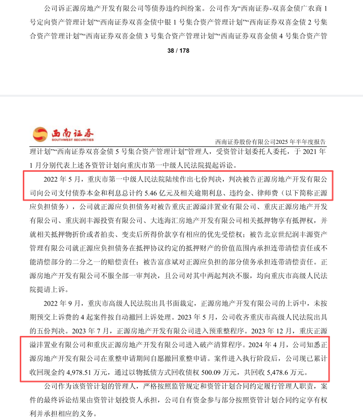 2019年,正源地产及关联公司债券违约,导致西南证券5只资管产品“踩雷”;2021年,西南证券因正源地产未偿付5.46亿元债本息起诉,2022年一审获判对正源关联公司抵押物享有抵押权,2023年法院对被执行人财产采取查封等措施。