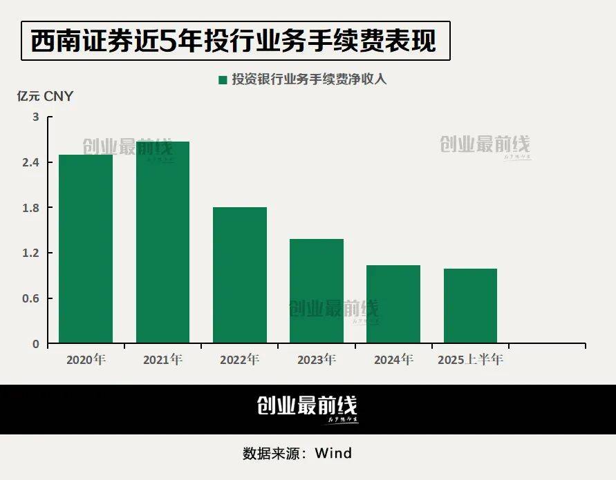 Wind数据显示,2020-2024年,西南证券投行业务手续费净收入分别为2.5亿元、2.67亿元、1.8亿元、1.38亿元、1.04亿元,自2022年连续三年下滑。