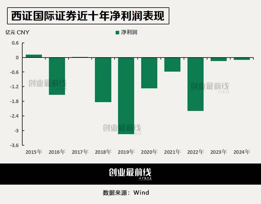 Wind数据显示,2018年-2024年,西证国际证券其净利润分别为-1.84亿元、-3.15亿元、-1.27亿元、-0.58亿元、-2.20亿元、-0.15亿元及-0.10亿元。