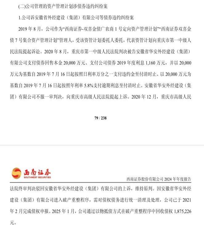 其中,安徽亳州房产涉及安徽省华安外经建设集团2019年债券违约案,西南证券2只资管产品卷入。法院判该集团偿付2.116亿元后,其进入破产重整;2025年1月西南证券通过以物抵债回收187.52万元。