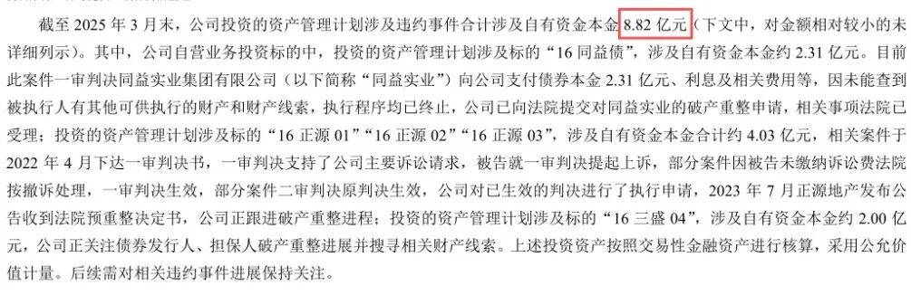 联合资信评级报告中称,截至2025年3月末,公司自营投资资产管理计划涉及违约规模较大,需对后续回收处置情况保持关注。