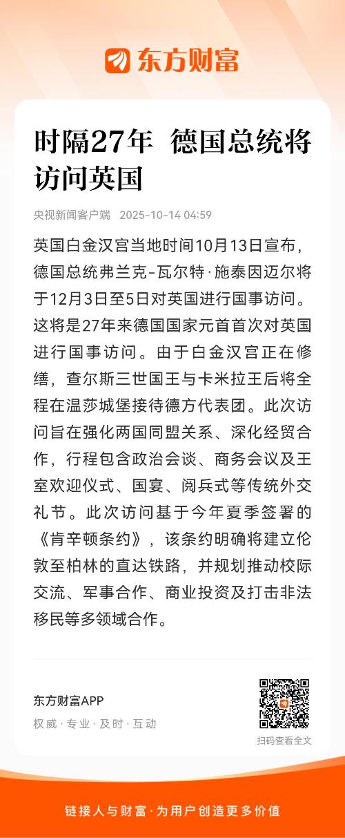 英国白金汉宫当地时间10月13日宣布,德国总统弗兰克-瓦尔特·施泰因迈尔将于12月3日至5日对英国进行国事访问。这将是27年来德国国家元首首次对英国进行国事访问。由于白金汉宫正在修缮,查尔斯三世国王与卡米拉王后将全程在温莎城堡接待德方代表团。此次访问旨在强化两国同盟关系、深化经贸合作,行程包含政治会谈、商务会议及王室欢迎仪式、国宴、阅兵式等传统外交礼节。此次访问基于今年夏季签署的《肯辛顿条约》,该条约明确将建立伦敦至柏林的直达铁路,并规划推动校际交流、军事合作、商业投资及打击非法移民等多领域合作。
