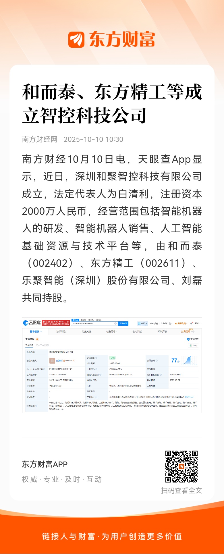 南方财经10月10日电,天眼查App显示,近日,深圳和聚智控科技有限公司成立,法定代表人为白清利,注册资本2000万人民币,经营范围包括智能机器人的研发、智能机器人销售、人工智能基础资源与技术平台等,由和而泰(002402)、东方精工(002611)、乐聚智能(深圳)股份有限公司、刘磊共同持股。