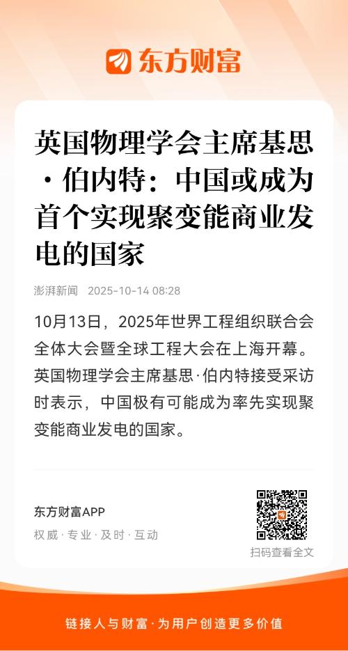 10月13日,2025年世界工程组织联合会全体大会暨全球工程大会在上海开幕。英国物理学会主席基思·伯内特接受采访时表示,中国极有可能成为率先实现聚变能商业发电的国家。