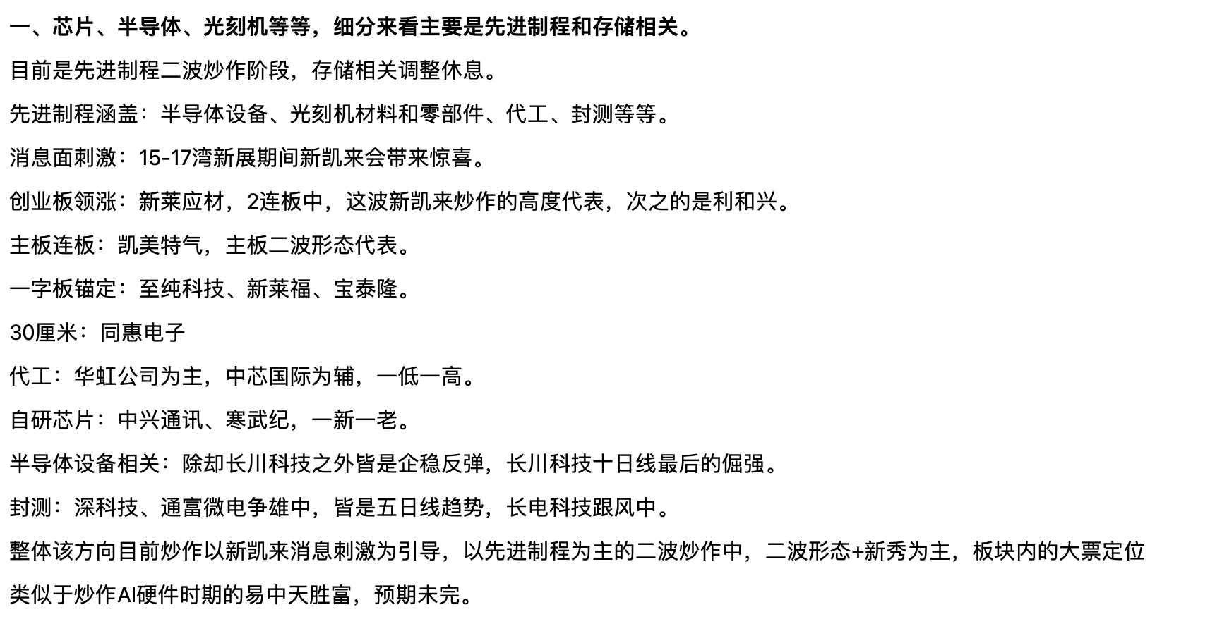 市场梳理:芯片半导体、核电、稀土金属相关、电池等等。