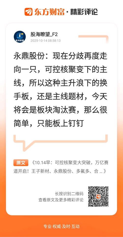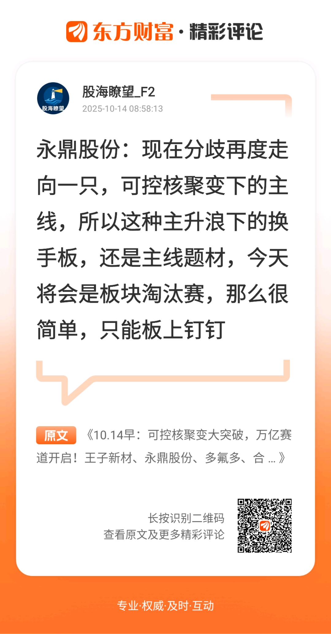 //@股海瞭望_F2 :永鼎股份:现在分歧再度走向一只,可控核聚变下的主线,所以这种主升浪下的换手板,还是主线题材,今天将会是板块淘汰赛,那么很简单,只能板上钉钉
