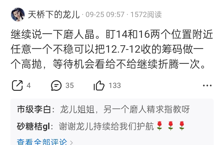 磨人晶上了14了。后续看14不稳可以把12.7-12收的筹码做一个高抛,或者后续哪天回踩破14一样可以高抛,14稳住等16附近做高抛。14或者16不稳还存在重新磨12.7-12的概率。到时候还是机会。这个票给你们跟了那么久时间。每个关键位置都给你们提醒,折腾不出利润就要考虑自己的原因了。