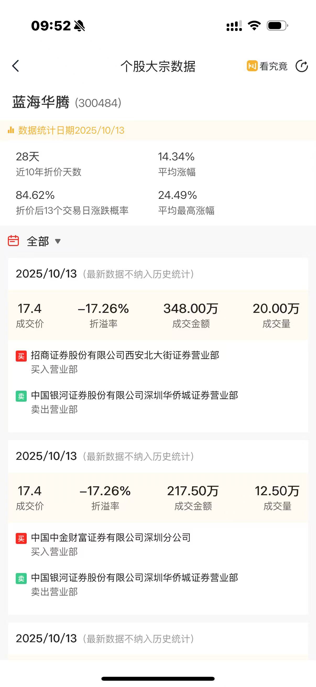 蓝海华腾昨天完成多笔大宗交易,数量不算多但是折价率挺高的,83折,但这票历史发生