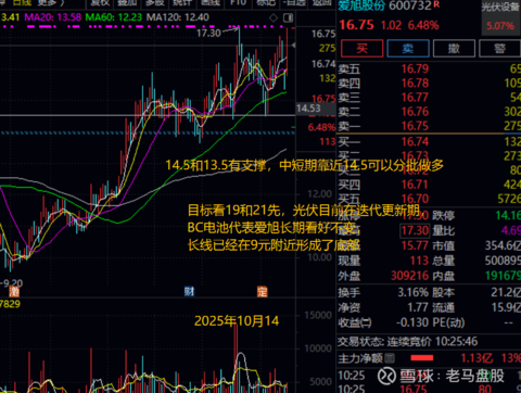 光伏板块最近再次拉升,除了阳光电源之外,是BC电池代表,可以长线关注,14.5和