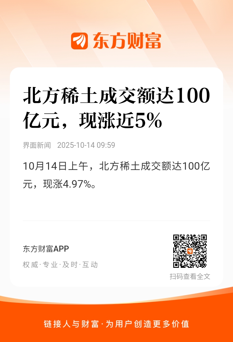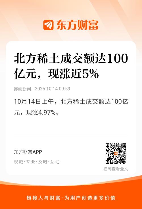 10月14日上午,北方稀土成交额达100亿元,现涨4.97%。