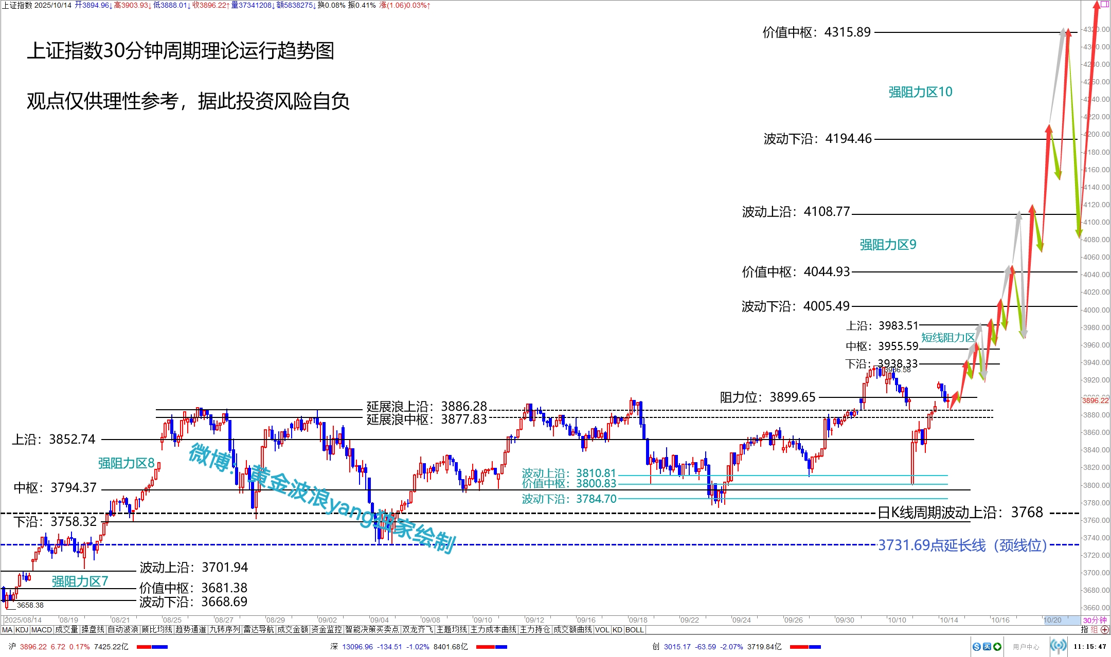 上证指数30分钟周期理论运行趋势图沪指目前盘中的“即时点位”下探至3887.54