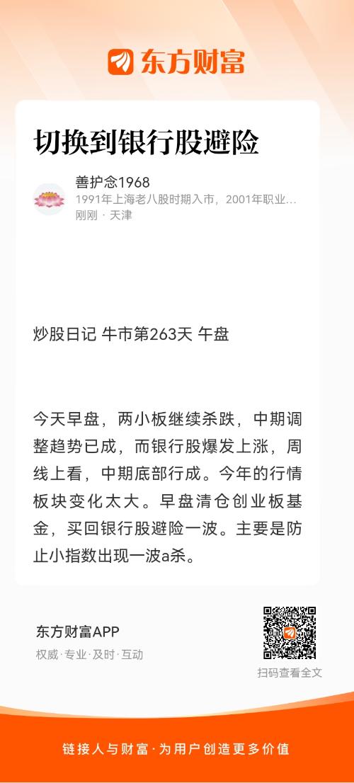 今天早盘,两小板继续杀跌,中期调整趋势已成,而银行股爆发上涨,周线上看,中期底部行成。今年的行情板块变化太大。早盘清仓创业板基金,买回银行股避险一波。主要是防止小指数出现一波a杀。