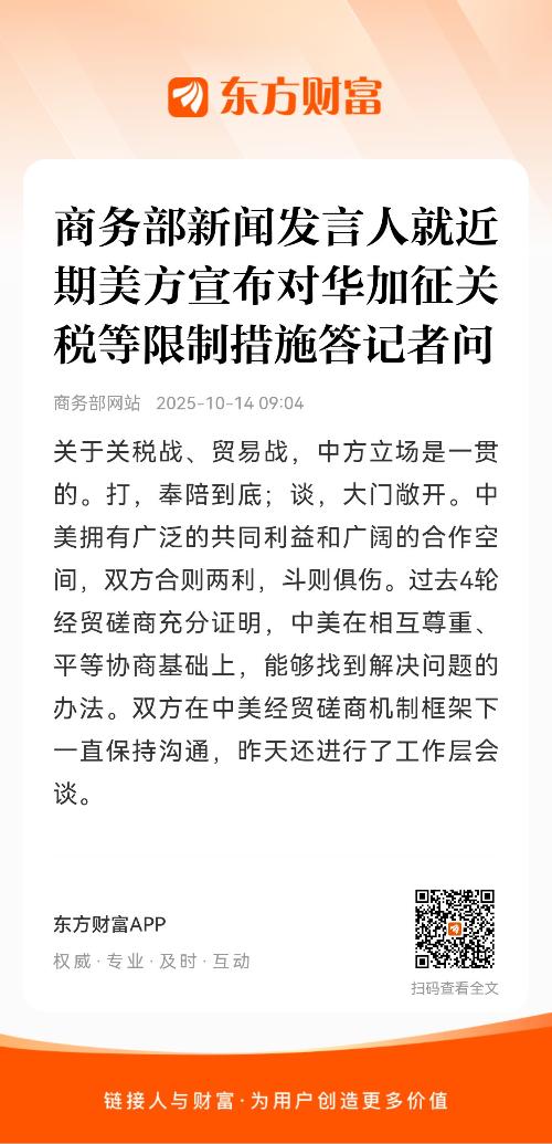 关于关税战、贸易战,中方立场是一贯的。打,奉陪到底;谈,大门敞开。中美拥有广泛的共同利益和广阔的合作空间,双方合则两利,斗则俱伤。过去4轮经贸磋商充分证明,中美在相互尊重、平等协商基础上,能够找到解决问题的办法。双方在中美经贸磋商机制框架下一直保持沟通,昨天还进行了工作层会谈。我想指出,美方不能一边要谈,一边威胁恐吓出台新的限制措施,这不是与中方相处的正确之道。中方敦促美方尽快纠正错误做法,拿出谈的诚意,与中方相向而行,以两国元首通话重要共识为引领,维护好来之不易的磋商成果,继续发挥中美经贸磋商机制作用,通过对话协商解决各自关切,妥善管控分歧,推动中美经贸关系健康、稳定、可持续发展。