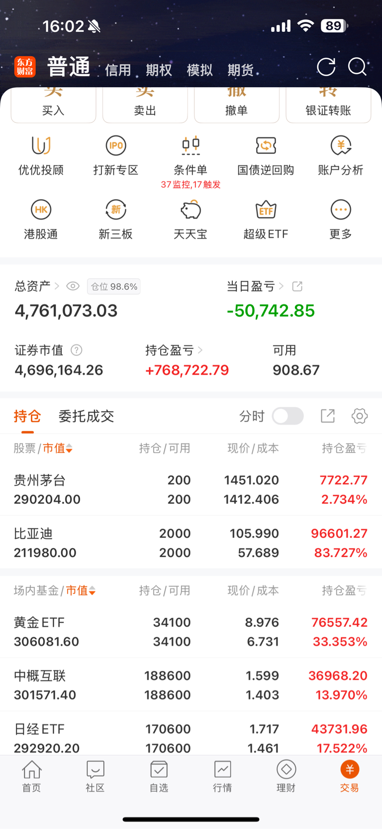 万日定投第154天,今日周定投日经ETF五千元,触发条件单17笔,买入13笔,卖出 4笔,今日收益: —5w