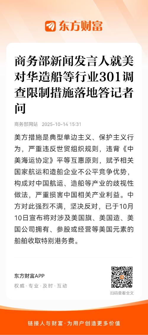 有记者问:美东时间10月14日,美国依据所谓301调查结果,正式对中国海事、物流和造船领域实施港口费等限制措施,请问中方对此有何回应?