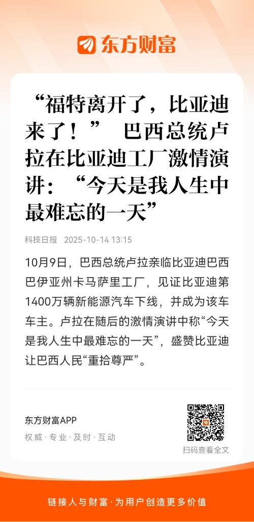 10月9日,巴西总统卢拉亲临比亚迪巴西巴伊亚州卡马萨里工厂,见证比亚迪第1400万辆新能源汽车下线,并成为该车车主。卢拉在随后的激情演讲中称“今天是我人生中最难忘的一天”,盛赞比亚迪让巴西人民“重拾尊严”。