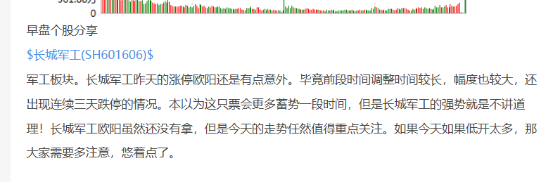 今天欧阳早间写的$长城军工(SH601606)$,由于有点事,错过了操作,真的是拍大腿。没错过的战友,也是吃上了一波行情。对于今天盘中的震荡行情,未尝不是好事。大家拭目以待吧。并且有些起涨的潜力板块,稀土、军工、核电等还处于低位,震荡蓄势,后期机会未必会少。大家关注欧阳,多留意欧阳的文章。有什么问题也欢迎大家在评论区交流,祝大家一路长虹。