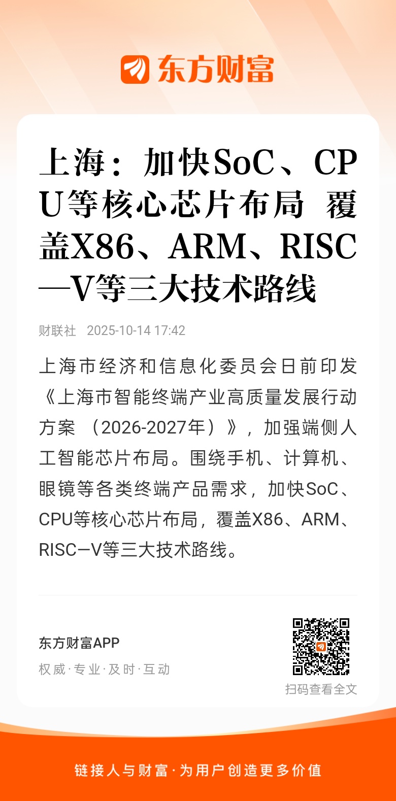 上海市经济和信息化委员会日前印发 《上海市智能终端产业高质量发展行动方案 (2026-2027年)》,加强端侧人工智能芯片布局。围绕手机、计算机、眼镜等各类终端产品需求,加快SoC、CPU等核心芯片布局,覆盖X86、ARM、RISC—V等三大技术路线。依托服务器算力芯片能力,积极布局端侧GPU芯片发展。支持3D异构集成关键技术突破,探索新型存储技术路线,支持近存、存内计算技术发展,支撑芯片平台算力和功耗水平提升。