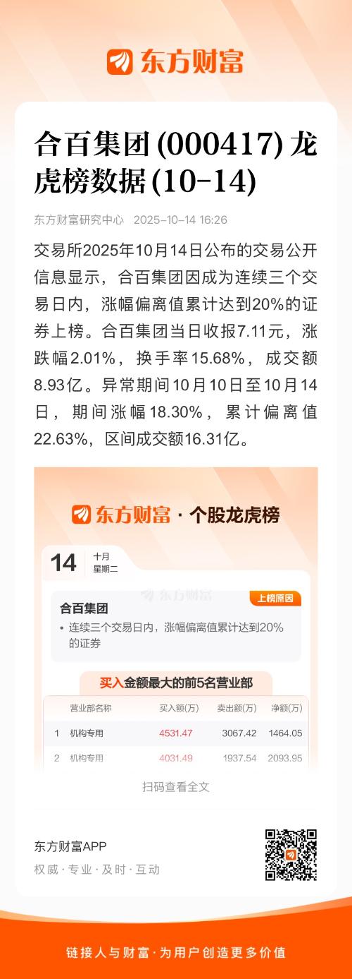 交易所2025年10月14日公布的交易公开信息显示,合百集团因成为连续三个交易日内,涨幅偏离值累计达到20%的证券上榜。合百集团当日收报7.11元,涨跌幅2.01%,换手率15.68%,成交额8.93亿。异常期间10月10日至10月14日,期间涨幅18.30%,累计偏离值22.63%,区间成交额16.31亿。