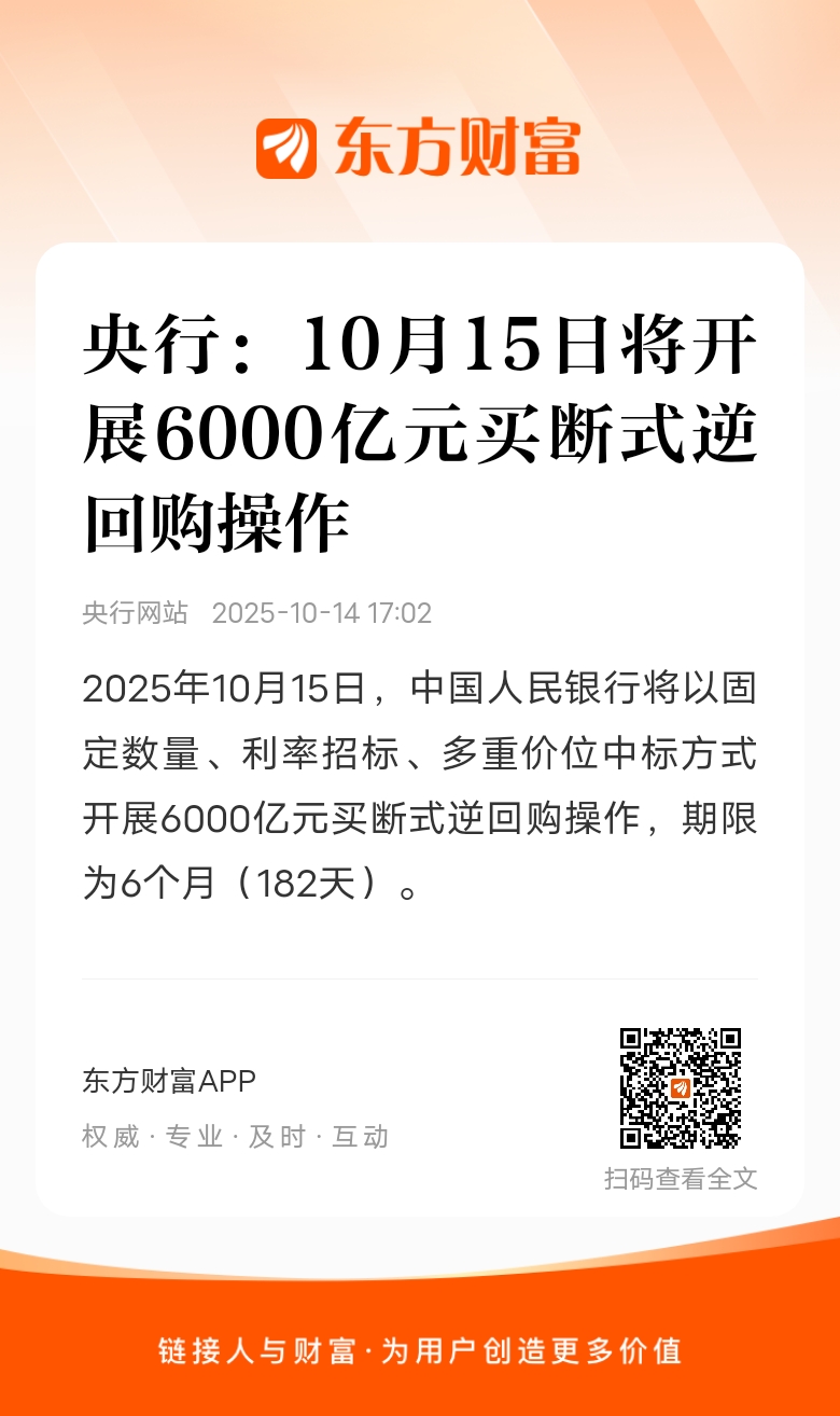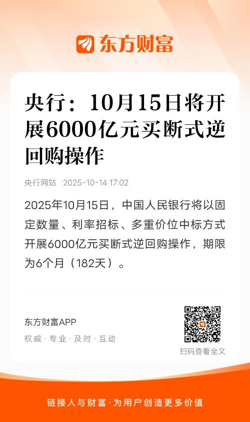 10月15日,中国人民银行开展6000亿元6个月期(182天)买断式逆回购操作,操作方式为固定数量、利率招标、多重价位中标。此举为10月第二次买断式逆回购操作,旨在保持银行体系流动性充裕,应对潜在资金面收紧压力。