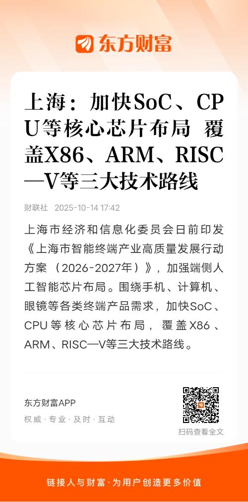 上海市经济和信息化委员会日前印发 《上海市智能终端产业高质量发展行动方案 (2026-2027年)》,加强端侧人工智能芯片布局。围绕手机、计算机、眼镜等各类终端产品需求,加快SoC、CPU等核心芯片布局,覆盖X86、ARM、RISC—V等三大技术路线。依托服务器算力芯片能力,积极布局端侧GPU芯片发展。支持3D异构集成关键技术突破,探索新型存储技术路线,支持近存、存内计算技术发展,支撑芯片平台算力和功耗水平提升。