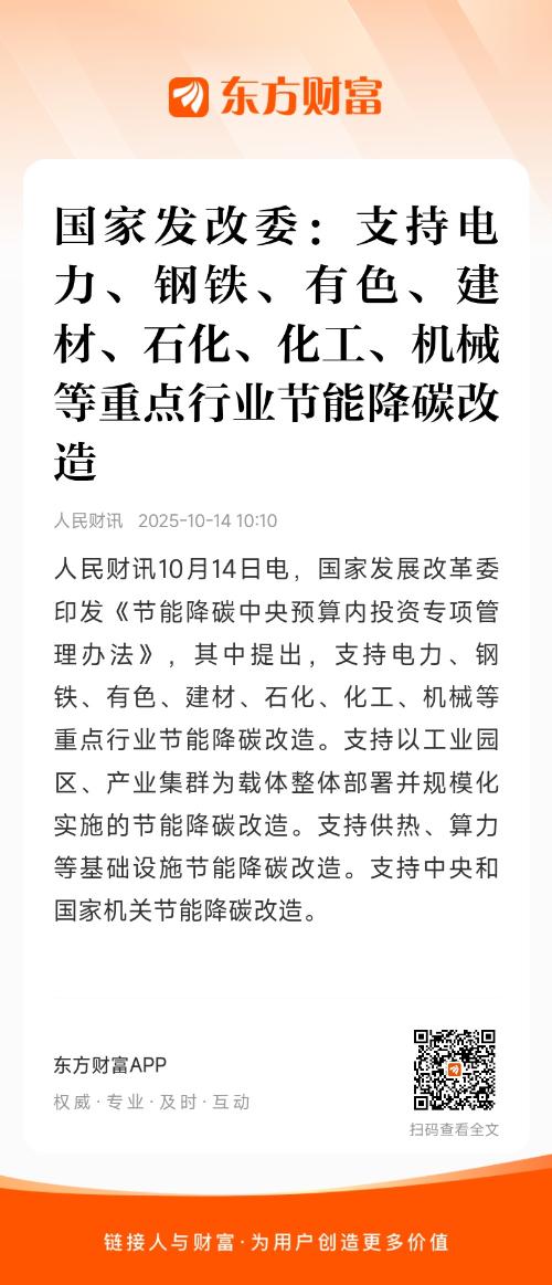 人民财讯10月14日电,国家发展改革委印发《节能降碳中央预算内投资专项管理办法》,其中提出,支持电力、钢铁、有色、建材、石化、化工、机械等重点行业节能降碳改造。支持以工业园区、产业集群为载体整体部署并规模化实施的节能降碳改造。支持供热、算力等基础设施节能降碳改造。支持中央和国家机关节能降碳改造。