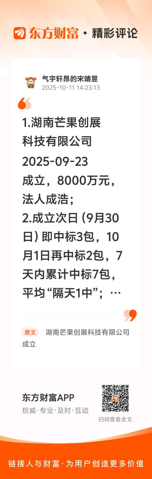 //@气宇轩昂的宋靖昱 :1.湖南芒果创展科技有限公司2025-09-23成立,8000万元,法人成浩;2.成立次日(9月30日)即中标3包,10月1日再中标2包,7天内累计中标7包,平均“隔天1中”;3.股东穿透:长沙马栏山投资(5亿,郭朝晖)+芒果超媒+中广天择(1.3亿,彭勇)——同一国资生态圈;4.请求:依据《招标投标法实施条例》第39、41条,立即暂停合同签订,对“先成立后中标、高频中标”是否涉嫌串标、量身定做启动调查。举报受理单位:行业监督:湖南省财政厅采购处/省住建招投标办纪检!机关12388.gov.cn;公安经侦110或长沙市公安局经侦支队。(中广天择传媒股份有限公司、长沙马栏山投资开发建设有限公司,这俩是这个公司的股东,这俩为什么从17日开始,资金交易频繁,一个转钱一个收钱,这几个公司会不会是专门创来转钱的呢?)