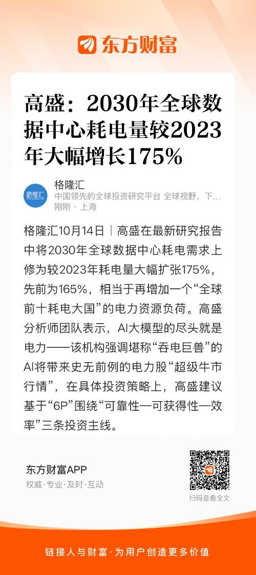 格隆汇10月14日|高盛在最新研究报告中将2030年全球数据中心耗电需求上修为较2023年耗电量大幅扩张175%,先前为165%,相当于再增加一个“全球前十耗电大国”的电力资源负荷。高盛分析师团队表示,AI大模型的尽头就是电力——该机构强调堪称“吞电巨兽”的AI将带来史无前例的电力股“超级牛市行情”,在具体投资策略上,高盛建议基于“6P”围绕“可靠性—可获得性—效率”三条投资主线。