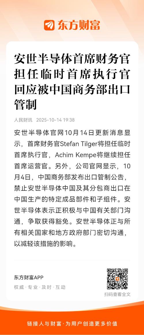 安世半导体官网10月14日更新消息显示,首席财务官Stefan Tilger将担任临时首席执行官,Achim Kempe将继续担任首席运营官。另外,公司官网显示,10月4日,中国商务部发布出口管制公告,禁止安世半导体中国及其分包商出口在中国生产的特定成品部件和子组件。安世半导体表示正积极与中国有关部门沟通,争取获得豁免。安世半导体正与所有相关国家和地方政府部门密切沟通,以减轻该措施的影响。
