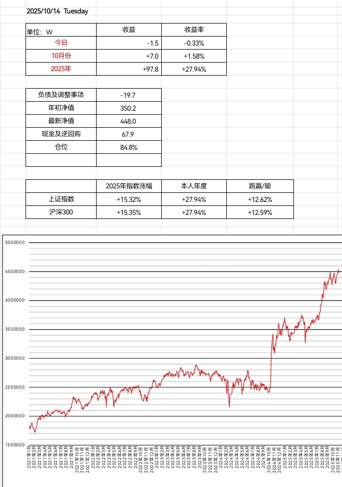 2025.10.14周二今天-1.5w(-0.33%)2025年+97.8w(+