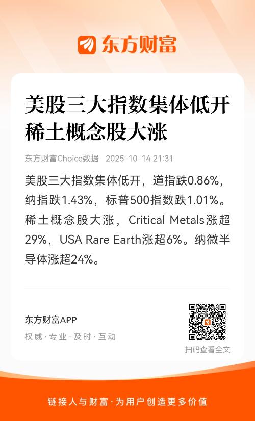 美股三大指数集体低开,道指跌0.86%,纳指跌1.43%,标普500指数跌1.01%。稀土概念股大涨,Critical Metals涨超29%,USA Rare Earth涨超6%。纳微半导体涨超24%。