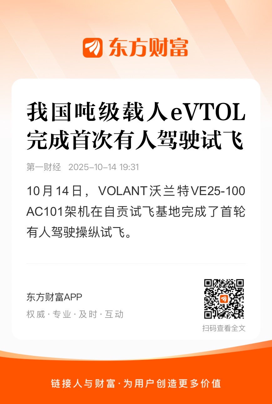 10月14日,VOLANT沃兰特VE25-100 AC101架机在自贡试飞基地完成了首轮有人驾驶操纵试飞。本轮试飞是融合CCAR23部和27部专用条件研制的高等级商用客运eVTOL的有人驾驶试飞,亦是我国吨级载人eVTOL的首次有人驾驶试飞。