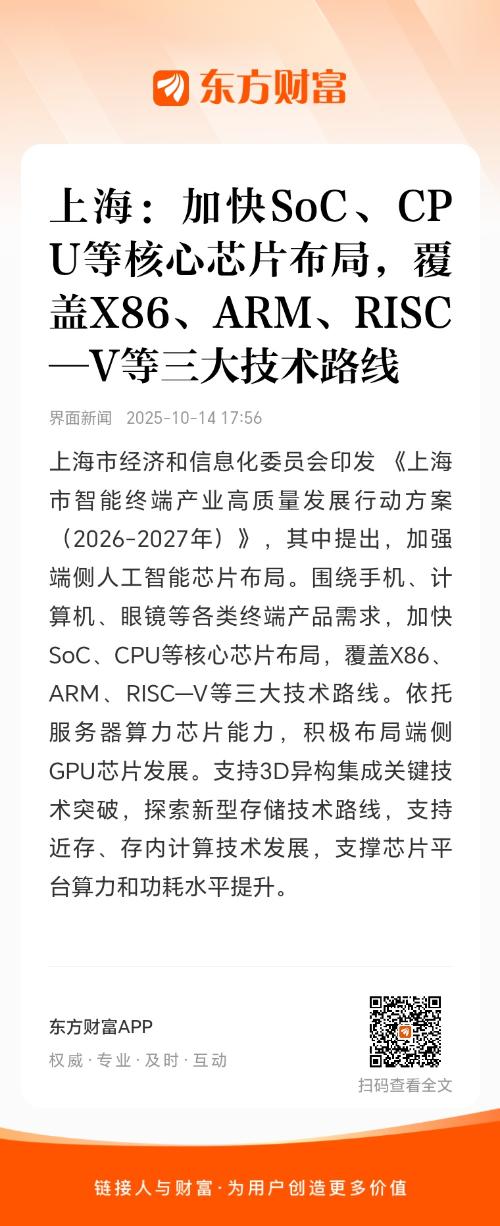 上海市经济和信息化委员会印发 《上海市智能终端产业高质量发展行动方案 (2026-2027年)》,其中提出,加强端侧人工智能芯片布局。围绕手机、计算机、眼镜等各类终端产品需求,加快SoC、CPU等核心芯片布局,覆盖X86、ARM、RISC—V等三大技术路线。依托服务器算力芯片能力,积极布局端侧GPU芯片发展。支持3D异构集成关键技术突破,探索新型存储技术路线,支持近存、存内计算技术发展,支撑芯片平台算力和功耗水平提升。