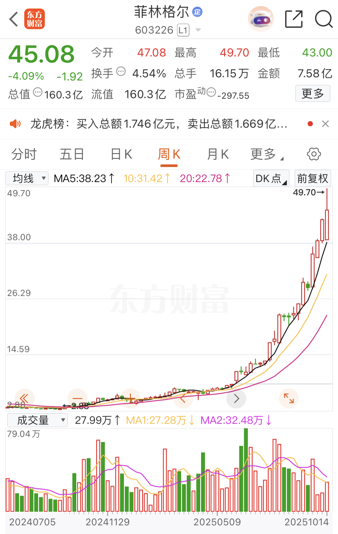 “持仓一年翻 15 倍,当初补仓的 2 万块现在能换辆车了!” 在菲林格尔(603226.SH)的投资者交流群里,这样的发言不断刷屏。2024 年 10 月至今,这家主营木地板的传统制造企业,上演了 A 股市场最令人瞠目的逆袭:股价从不足 3 元起步,最高冲至 49.70元,即便截至 2025 年 10 月 14 日回落至 45.08 元,区间涨幅仍超 15 倍,总市值飙升至 160 亿元。更反常的是,这场财富盛宴的主角并非机构主力,而是扎堆涌入的散户群体,让 “菲林格尔奇迹” 成为资本市场热议的焦点。