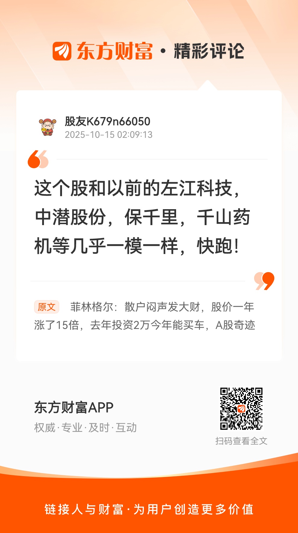这个股和以前的左江科技,中潜股份,保千里,千山药机等几乎一模一样,快跑! 我在《菲林格尔:散户闷声发大财,股价一年涨了15倍,去年投资2万今年能买车,A股奇迹》的评论获得了大家的关注。