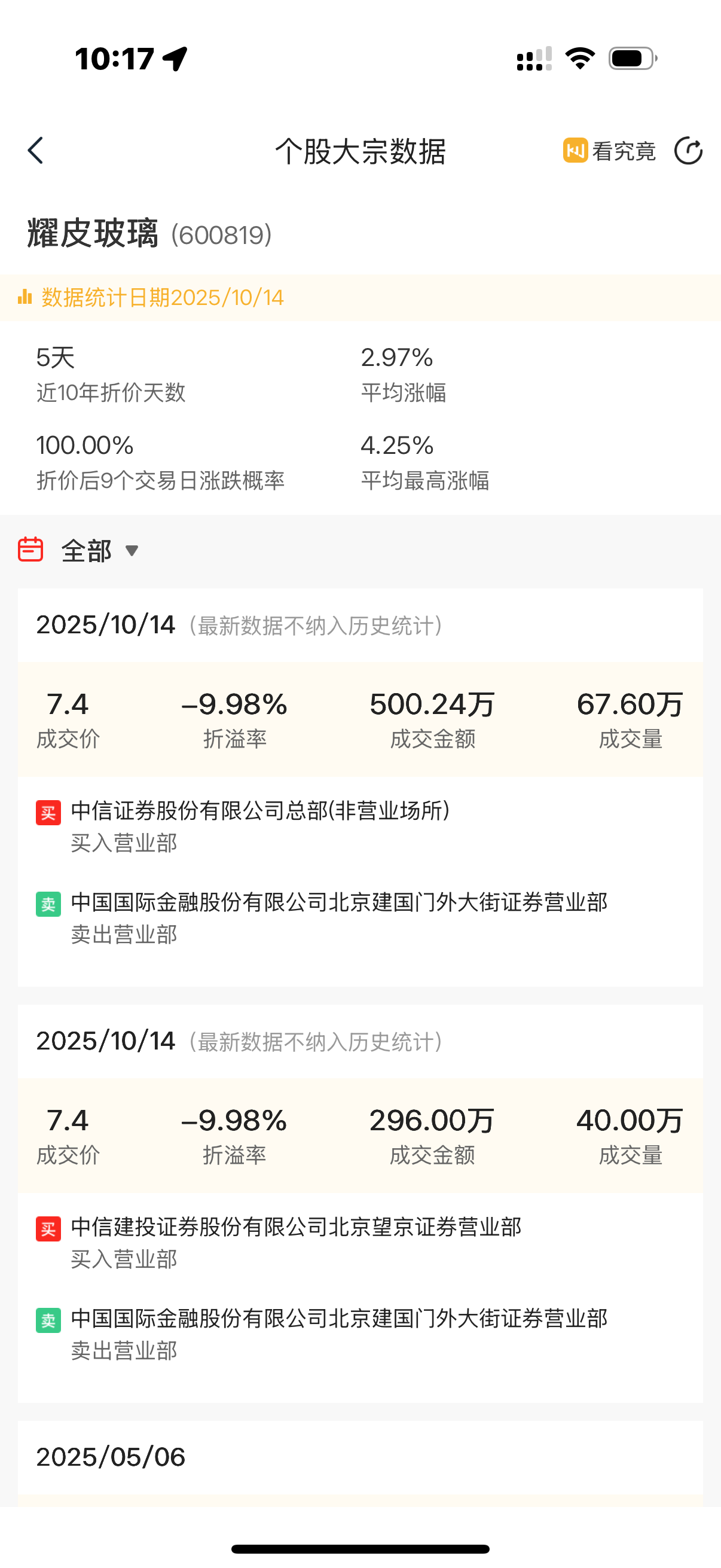 耀皮玻璃昨天完成两笔大宗交易,折价不算高,成交量107万股,这票历史发生折价不算