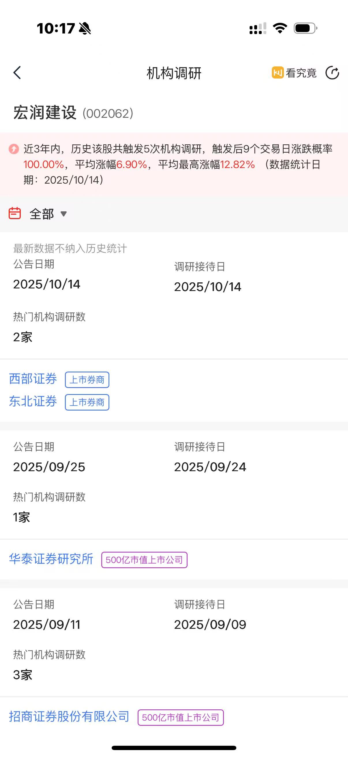 宏润建设昨日接受西部证券、东北证券等机构调研,这票历史接受过多次调研,而且每次调
