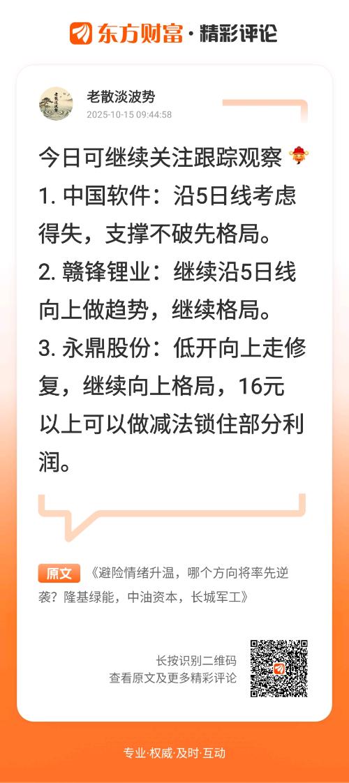 同时,继续持有 永鼎股份、中国软件、赣锋锂业,结构仍在趋势中,可持续跟踪观察。