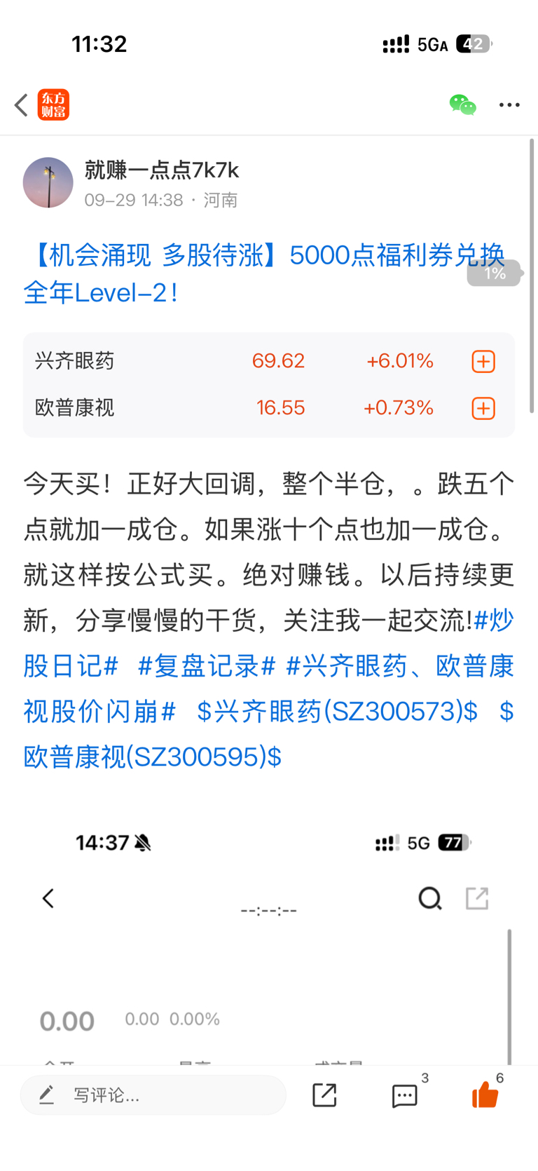 前几天发了帖子,预测兴齐眼药可以建仓了,上车的老师们如何了呀,如今持续上涨,今后分享更多技巧,老师们快来关注我一起探讨更多股票