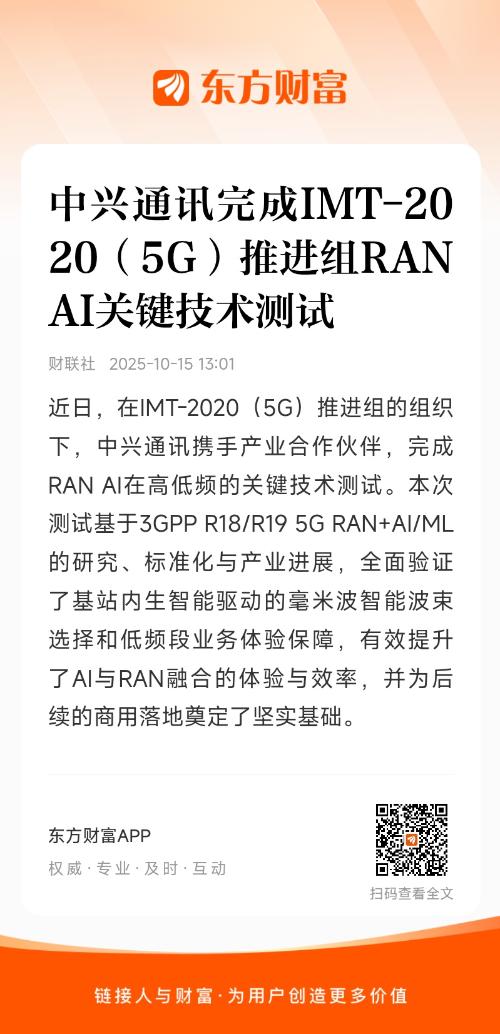 近日,在IMT-2020(5G)推进组的组织下,中兴通讯携手产业合作伙伴,完成RAN AI在高低频的关键技术测试。本次测试基于3GPP R18/R19 5G RAN+AI/ML的研究、标准化与产业进展,全面验证了基站内生智能驱动的毫米波智能波束选择和低频段业务体验保障,有效提升了AI与RAN融合的体验与效率,并为后续的商用落地奠定了坚实基础。