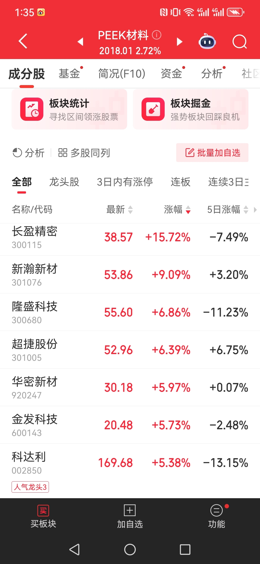 #复盘记录# #炒股日记# #实盘记录# PEEK材料盘中异动,目前板块指数涨幅第二,长盈精密涨幅超过15%,新瀚新材跟涨!